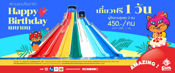 มอบของขวัญสุดพิเศษในเดือนพิเศษของคุณ เที่ยวฟรี 1 วัน! เล่นจุใจไม่อั้นรวมเครื่องเล่นในสวนสนุกและโซนสวนน้ำ ชวนใครก็ได้มากรี๊ดฉลองด้วยกัน ในราคาพิเศษ 450.-/คน ไม่เกิน 2 คน